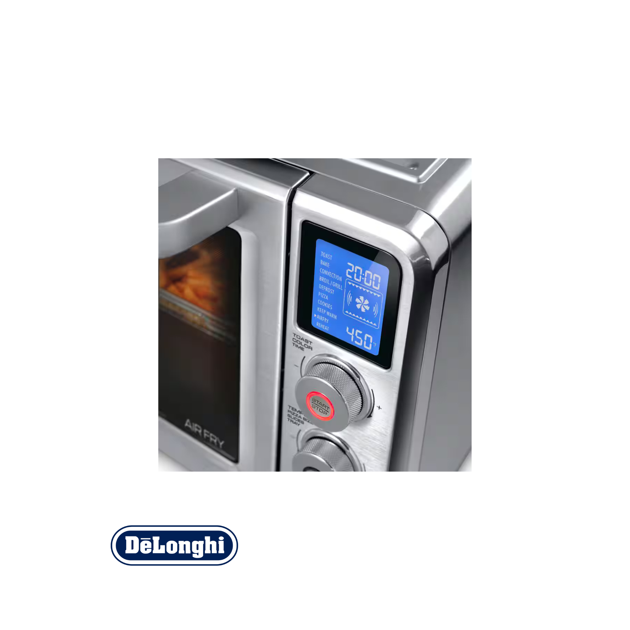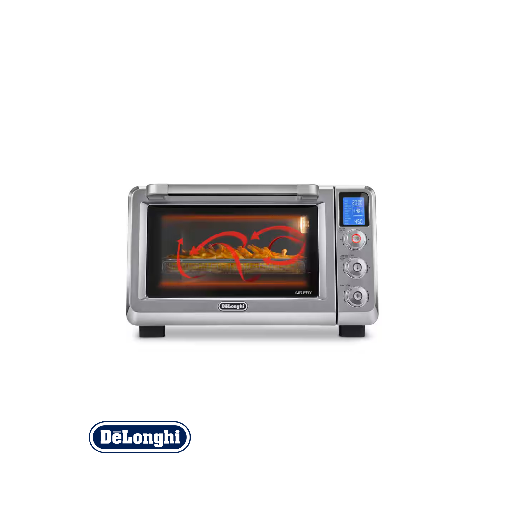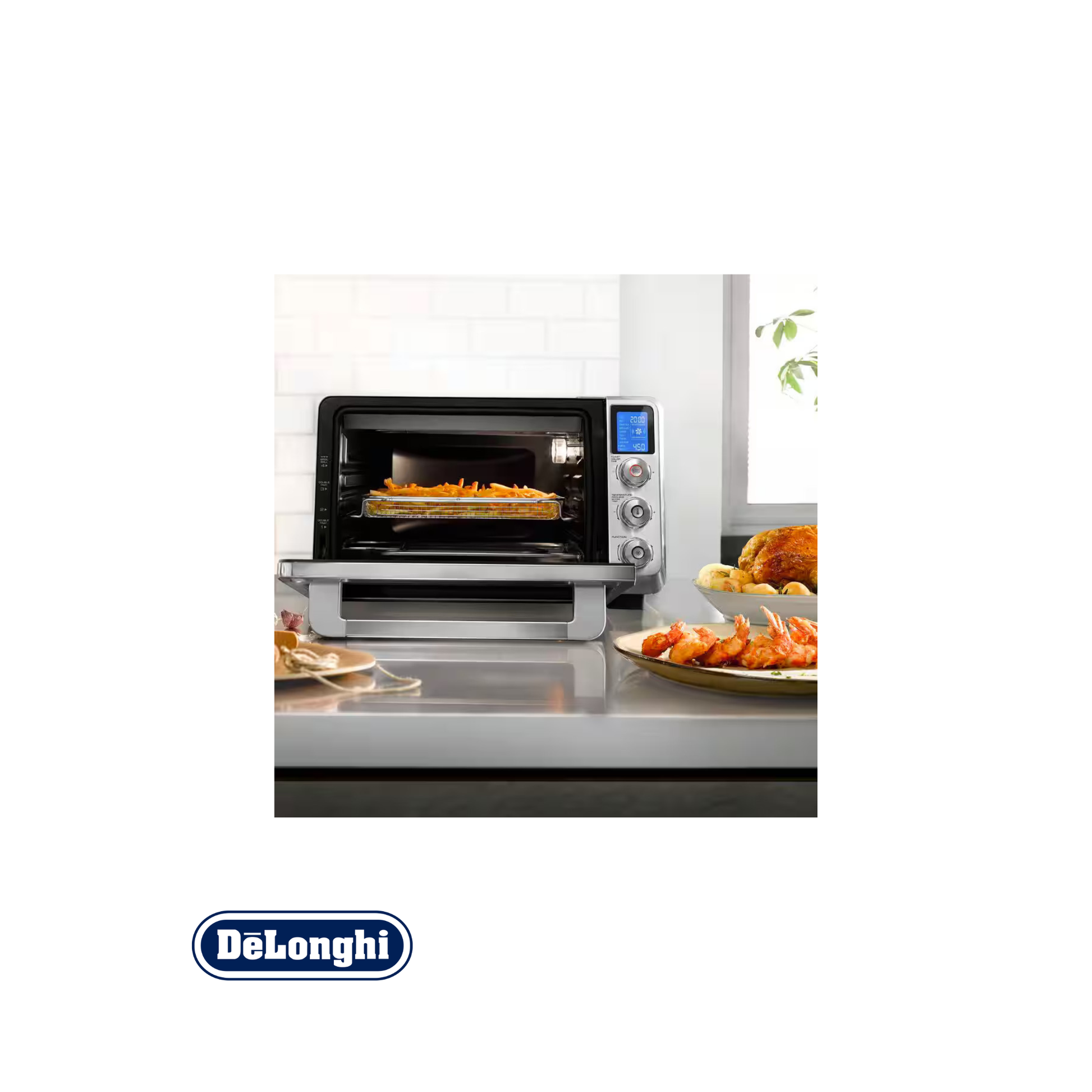 - Diseñado para retener el calor. Cada horno de aire caliente De'Longhi cuenta con un sistema de bloqueo de calor. Una puerta de doble cristal y una junta, al igual que un horno convencional, garantizan que el calor se mantenga en el interior para un funcionamiento más rápido y una mayor eficiencia energética.